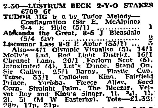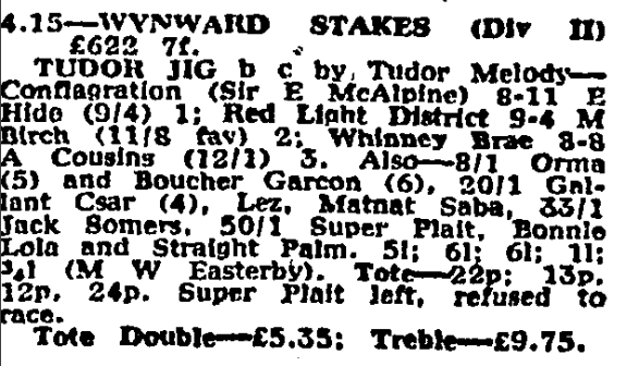 After failing to attract a bid at the Newmarket Sales I offered to train Tudor Jig for Sir Edwin McAlpine. He won four times on the flat, including the Northern Free Handicap at Newcastle, before contesting the 1977 2000 Guineas. He also ran in the Dante Stakes at York where he finished fourth, having not stayed out the trip. Switched to hurdling he made his debut when unplaced at Market Rasen, before wins at Wetherby and Teesside. He was top weight for the 1978 Lincoln but after running poorly at Newcastle he was withdrawn from the race. He made a final appearance on the racecourse at Newbury in 1980 where he was unplaced before retiring. Tudor Jig was sold to stand in South Africa as a stallion.