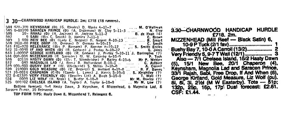 Mizzenhead made his debut over hurdles at Stockton in January 1980 where he gave a suggestion of ability by finishing 6th of 16 runners but he didn't see the two miles out properly. I decided to drop him back in trip on the flat and found a little race, again at Stockton, where he came in fifth. A few weeks later he showed a great deal of improvement and finished runner up at Hamilton Park under my marvellous stable jockey Terry Lucas. He was second favourite that day but was outpointed by a 29/1 outsider trained by Gordon Richards.